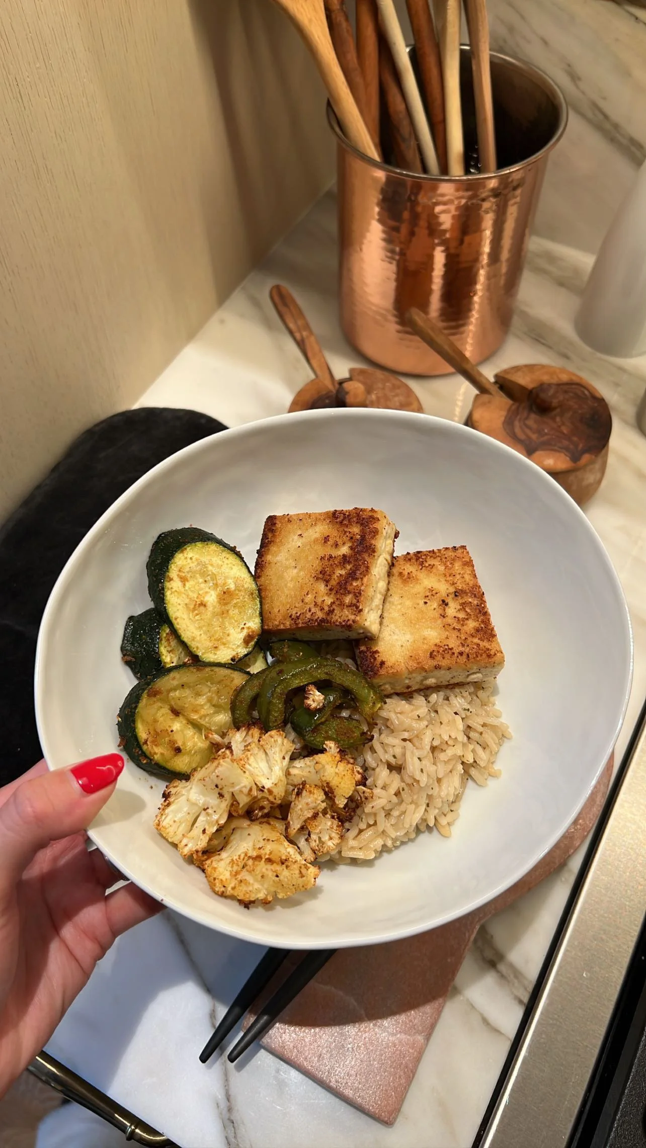 Create a little grain bowl with your farro/brown rice as your base, then sides of veggies and tofu.